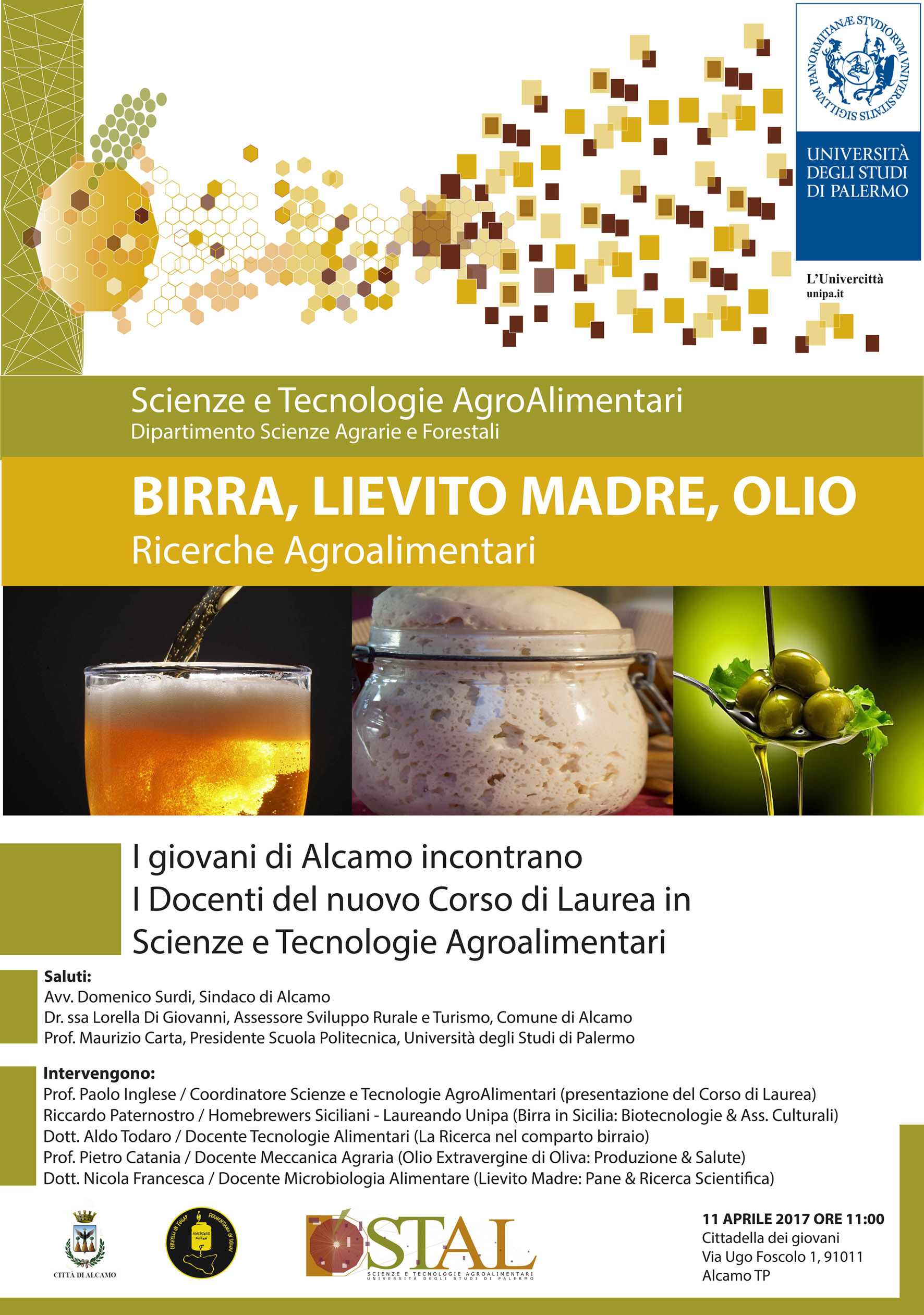 Oltre al sindaco di Alcamo, Domenico Surdi, e all’assessore al Turismo e allo Sviluppo rurale Lorella Di Giovanni, interverranno il prof. Maurizio Carta, Presidente Scuola Politecnica dell’Università di Palermo; interverranno, il prof Paolo Inglese, coordinatore scienze e tecnologie agroalimentari, che presenterà il corso di laurea, il dott. Aldo Todaro, docente tecnologie alimentari, che parlerà della ricerca nel comparto birraio, il prof. Pietro Catania, docente di meccanica agraria, che parlerà dell’Olio extravergine di oliva, il dott. Nicola Francesca, docente di microbiologia alimentare, che parlerà del lievito madre e Riccardo Paternostro laureando, parlerà della Birra in Sicilia, biotecnologie & associazioni culturali.