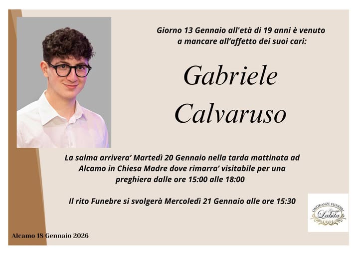 Sarà celebrato mercoledì alle 15.30, nella Chiesa Madre di Alcamo, il funerale di Gabriele Calvaruso, il diciannovenne morto a seguito del grave incidente stradale avvenuto nel viale Europa lo scorso 13 gennaio. Le indagini sulle cause dello scontro sono ancora in corso. La salma arriverà ad Alcamo nella tarda mattinata di domani e sarà portata in Chiesa Madre, dove sarà possibile sostare in preghiera dalle 15 alle 18. Intanto il luogo dell’incidente continua a diventare meta di gruppi di giovani che lasciano fiori, messaggi e pensieri in memoria del ragazzo. Nei giorni scorsi si è svolta anche una veglia di preghiera nella parrocchia del Sacro Cuore di Gesù, segno di una comunità ancora scossa e raccolta attorno al dolore della famiglia.