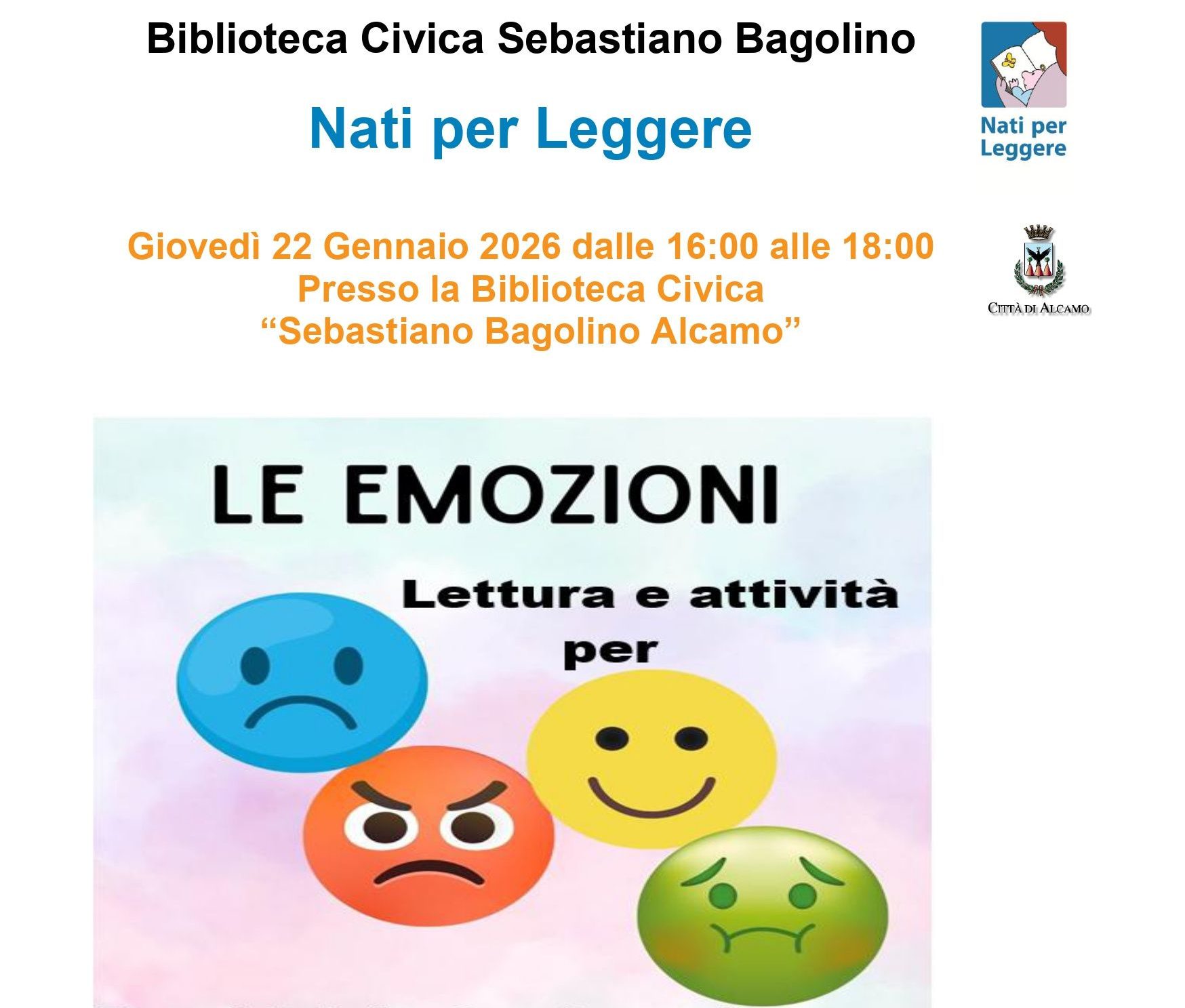 Giovedì dalle 16 alle 18, la Biblioteca Civica “Sebastiano Bagolino” di Alcamo ospita un nuovo appuntamento di Nati per Leggere. Al centro dell’incontro il tema delle emozioni, con letture animate e attività pensate per bambini da 0 a 6 anni. Un momento educativo e condiviso per accompagnare i più piccoli nella scoperta dei sentimenti attraverso i libri. L’iniziativa è rivolta alle famiglie e mira a promuovere la lettura sin dalla prima infanzia. Partecipazione su prenotazione.