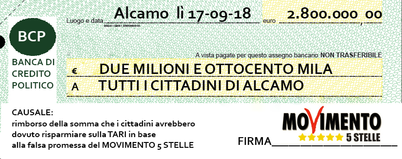 Il nuovo mini appalto da sei mesi per la raccolta dei rifiuti ad Alcamo fa esplodere la polemica politica in consiglio comunale con tanto di simpatico siparietto. Nella seduta di ieri sera il consigliere comunale del Pd Filippo Cracchiolo si è presentato provocatoriamente con un mega assegno da 2,8 milioni di euro e lo ha consegnato alla presidenza del consiglio per recapitarlo al sindaco Domenico Surdi, ieri assente ai lavori. La cifra è pari ai due anni di governo ad Alcamo del Movimento 5 Stelle che aveva promesso sull’appalto dei rifiuti un risparmio annuale di 1,4 milioni. Il recente piano approvato dal Comune invece ammonta a 5,5 milioni di euro l’anno, lo stesso identico costo che oggi è previsto per questo appalto. Per questo i Democratici sono andati all’attacco con la provocazione dell’assegno: