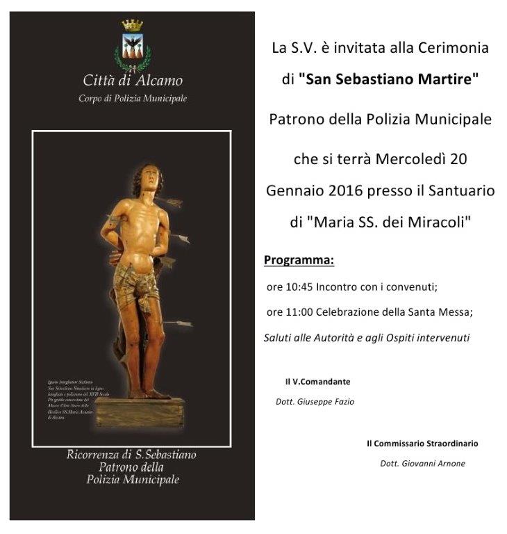Il Corpo di Polizia municipale del Comune di Alcamo organizza, per mercoledì 20 gennaio prossimo, la cerimonia in onore di san Sebastiano Martire, patrono della Polizia municipale in programma ad Alcamo mercoledì 20 gennaio. Alle ore 11:00, alla presenza del commissario straordinario, Giovanni Arnone e delle autorità, sarà celebrata la santa messa presso il santuario di Maria SS. dei Miracoli; durante la cerimonia è previsto il conferimento di un pubblico riconoscimento a tre agenti della Polizia municipale che si sono distinti nell’ambito del proprio servizio.