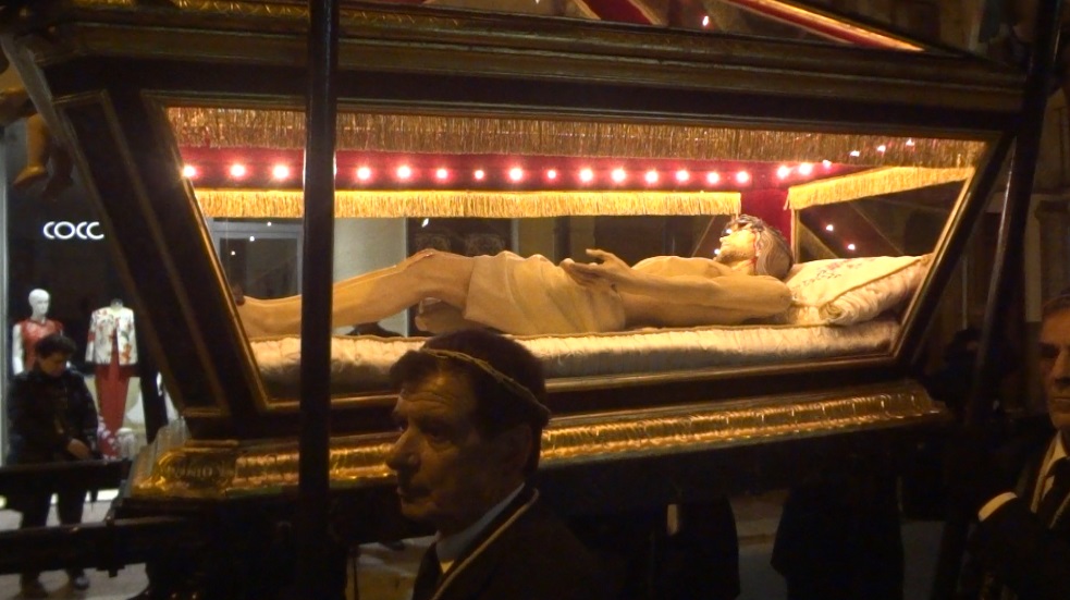 Sia la bara del Cristo morto che il simulacro dell’Addolorata sono stati portati in spalla dai congreganti che per l’occasione vestono di nero con una corona di spine sul capo e l'”abitino” sulle spalle e sul petto. I confrati hanno accompagnato il gruppo del Cristo Morto mentre le donne, le consorelle, il gruppo della Madonna Addolorata.