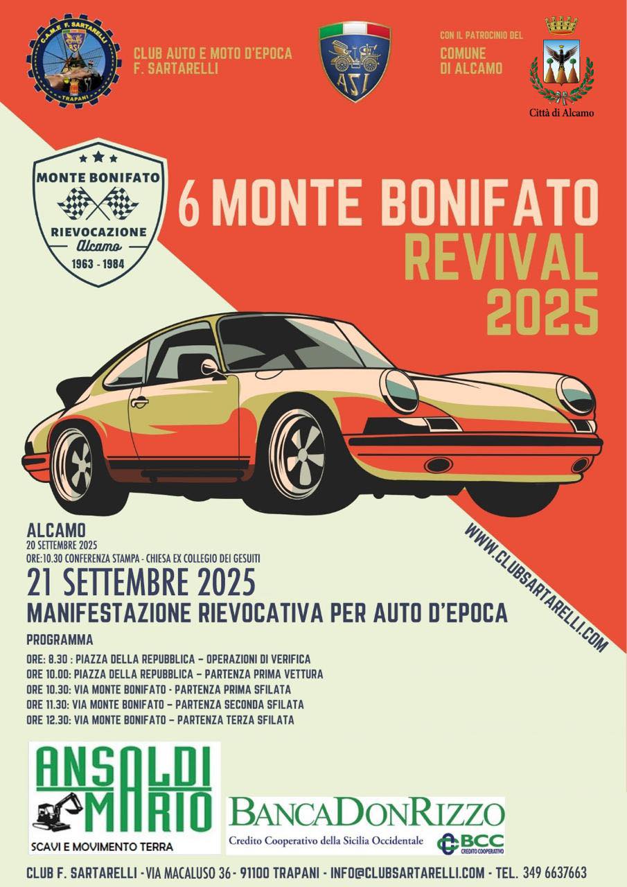 Domenica 21 settembre andrà in scena “6 monte Bonifato Revival 2025”, manifestazione rievocativa per auto d’epoca. Nella mattina di sabato si terrà la conferenza stampa nella chiesa Ex Collegio dei Gesuiti. L’itinerario del giorno seguente partirà alle 10 da Piazza della Repubblica, e si chiuderà alle 12.30, al monte Bonifato.