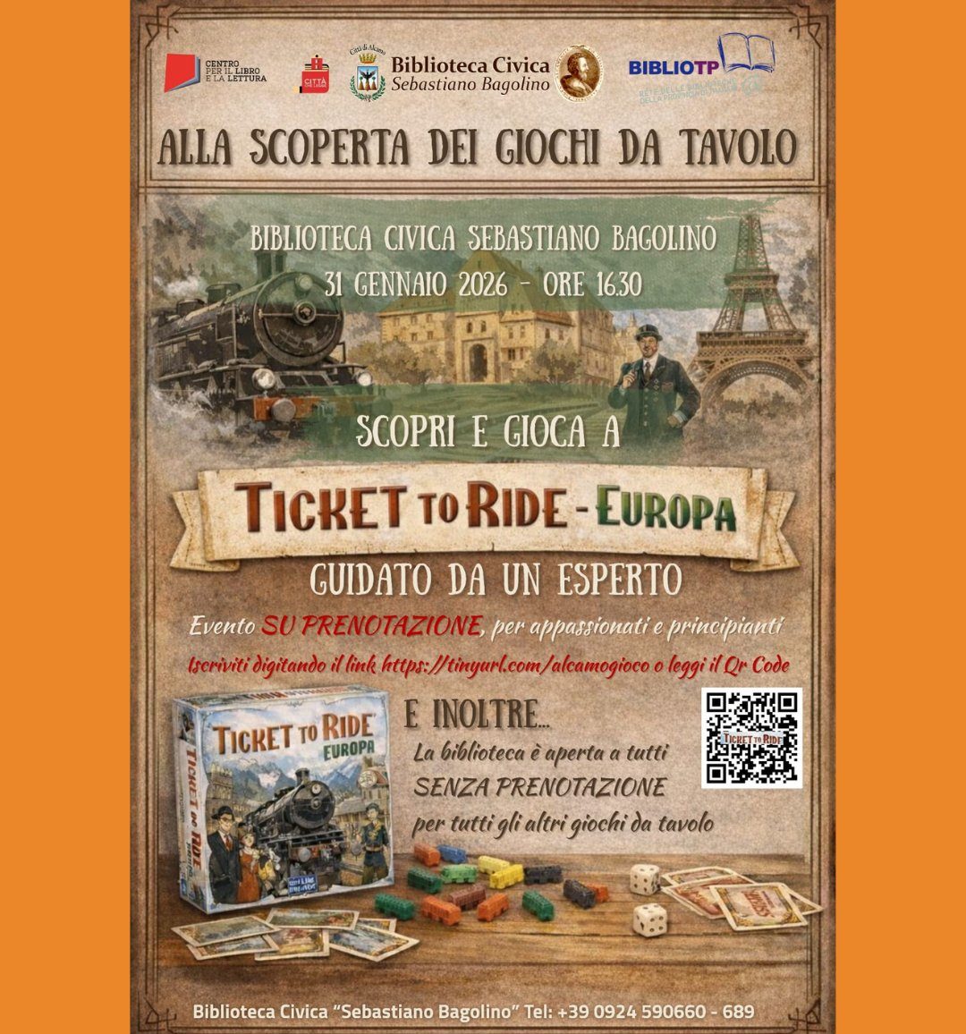 La biblioteca civica Sebastiano Bagolino di Alcamo diventata un punto di riferimento per varie attività culturali tra le quali iniziative per invitare alla lettura. Ora arriva una nuova offerta, Infatti sabato prossimo a partire dalle 16.30, in biblioteca, è il turno di “Ticket to ride”, il famoso gioco di avventure ferroviarie che consentirà di viaggiare e fermarsi nelle stazioni di tutta Europa, senza spostarsi dalla sedia. Un esperto seguirà nel gioco, per imparare le regole di base, entrare nel meccanismo dei servizi nella stazioni.