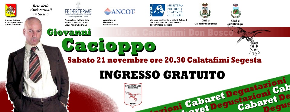 Grande serata di spettacolo a Calatafimi, sabato 21 novembre, nei locali del Palasegesta alle ore 20:30 con il noto cabarettista Giovanni Cacioppo e la partecipazione di diversi talenti locali; nel dopo spettacolo anche una ricca degustazione di eccellenze gastronomiche tipiche. L’iniziativa denominata “Terme, Salute e Spettacolo” e affidata alla storica associazione locale U.s.D. Calatafimi Don Bosco, nasce dalla “Rete delle Città Termali in Sicilia” che vede l’aggregazione di 11 comuni di tutta la Regione con l’obiettivo di sviluppare il turismo termale tramite la formula dello show. Durante la serata saranno distribuiti gratuitamente centinaia di vaucher per l’ingresso in strutture termali, lo spettacolo non prevede nessun ticket d’ingresso.