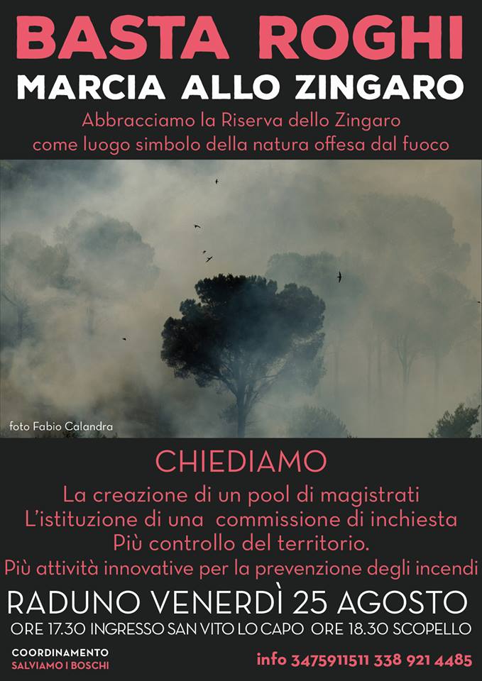Una marcia per dire no agli incendi che hanno aggredito decine di ettari di verde che vanno da Scopello a San Vito Lo Capo. La marcia è stata promossa dal comitato spontaneo “Salviamo i boschi”, del quale fanno parte una quarantina di associazioni e non solo siciliane. La marcia è stata presentata stamane al Castello di Castellammare. La marcia è stata programmata per venerdì pomeriggio. Una marcia silenziosa e simbolica che attraverserà la Riserva dello Zingaro. Un gruppo patirà dal parcheggio, lato Scopello, altri partiranno dal lato San Vito Lo Capo per poi incontrarsi tutti al Museo naturalistico. Con la marcia “Salviamo i boschi” intende lanciare l’appello per la salvaguardia del verde in tutta la Sicilia, martoriata da incendi, quasi sempre dolosi, da parte di individui che non hanno alcun rispetto per la Natura. La solidarietà alla terra e all’ambiente arriverà quindi venerdì nella prima Riserva istituita in Sicilia, ferita quest’estate da due incendi che ne hanno dimezzato la vegetazione. Durante questa estate oltre 20 mila ettari di vegetazione in Sicilia sono stati distrutti dalle fiamme, che hanno raso al suolo anche abitazioni e ucciso tantissimi animali. Una marcia che sembra ricalcare quella del 1980 quando associazioni ambientaliste riuscirono a bloccare la costruzione di una strada che avrebbe distrutto e sventrato montagne per unire San Vito Lo Capo con Castellammare. Grazie ad una legge regionale poi vennero istituite le Riserve, tra le quali uno dei primi posti in Sicilia occupa quella dello Zingaro, ogni anno visitata da migliaia di persone.