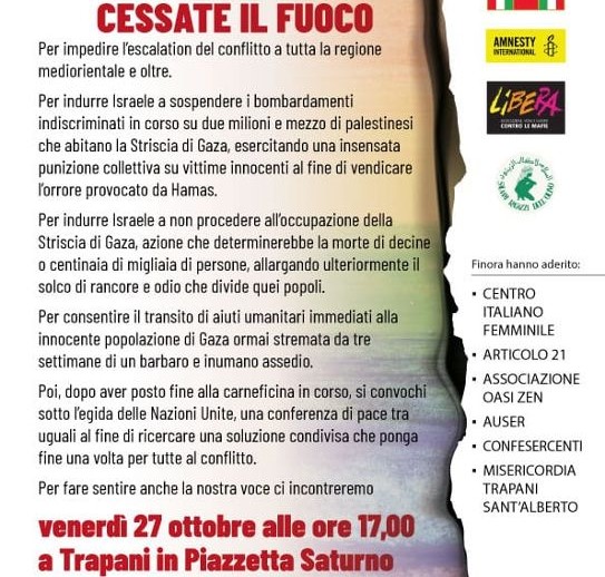 Domani pomeriggio, alle ore 17 a Trapani, sit in in piazzetta Saturno contro tutte le guerre. I cittadini trapanesi, insieme a tutti i popoli del mondo, chiedono che l’Onu e le diplomazie dei governi di tutti i paesi intervengano per imporre alle parti in conflitto un immediato e completo “cessate il fuoco”, per impedire l’escalation del conflitto a tutta la regione mediorientale e oltre. L’incontro è promosso da CGIL, ANPI, Amnesty International e Libera.