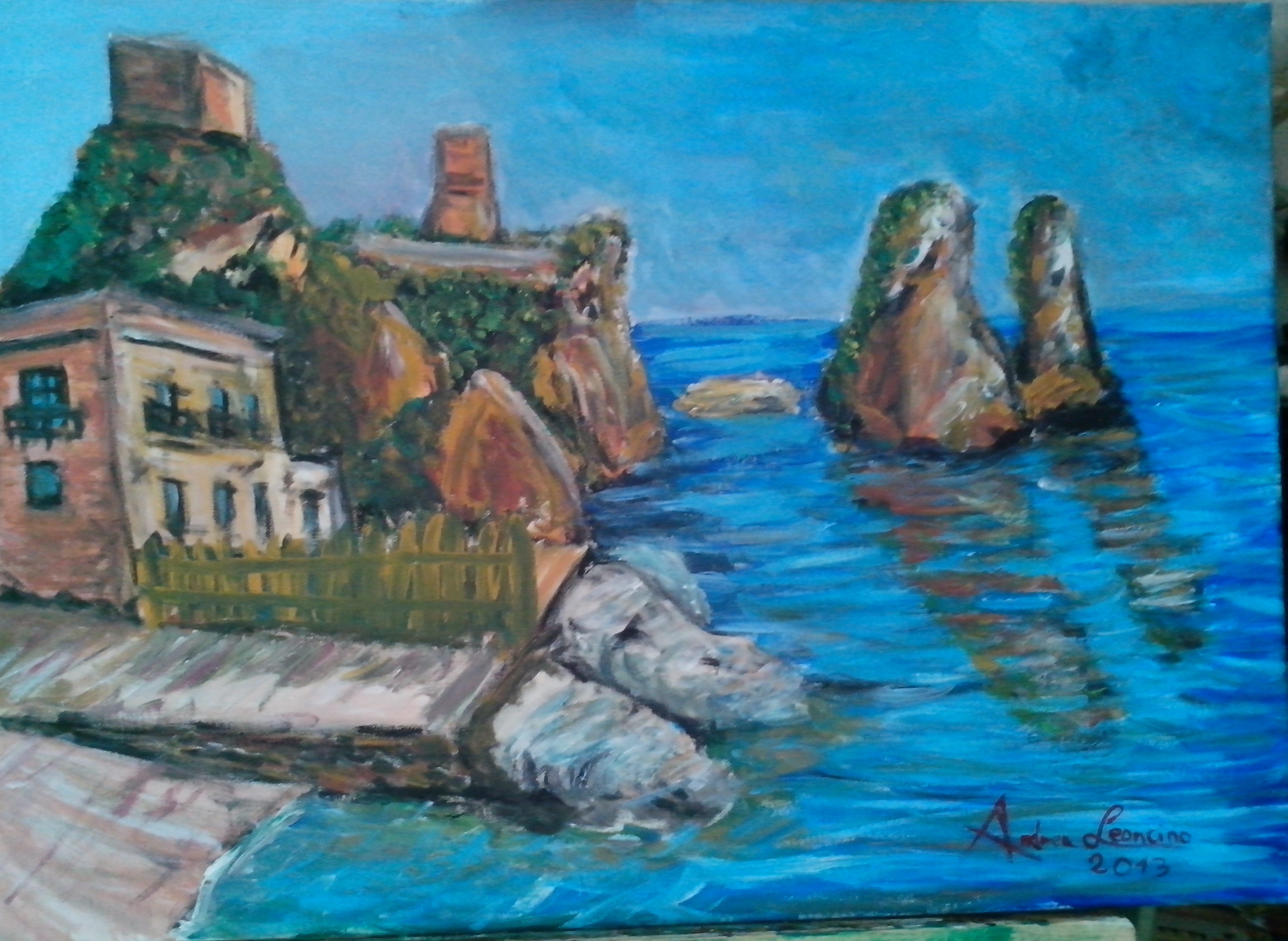“Quella di Andrea Leoncino è una pittura dai forti contrasti cromatici. Terra scura, affascinante ed aspra, pietre magmatiche, dammusi, ginestre e melograni, capperi e fichi d’india che si confondono con il paesaggio in uno scenario di tramonti infuocati che si tuffano in un mare rosso acceso. Leoncino dipinge le sue origini. Nei suoi colori c’è il sapore dei ricordi panteschi scritti su nerissime pietre affiorate dalle viscere di una terra che odora di zolfo e mostra una natura caparbiamente verde-naif…” scrive la professoressa Pietra De Blasi.