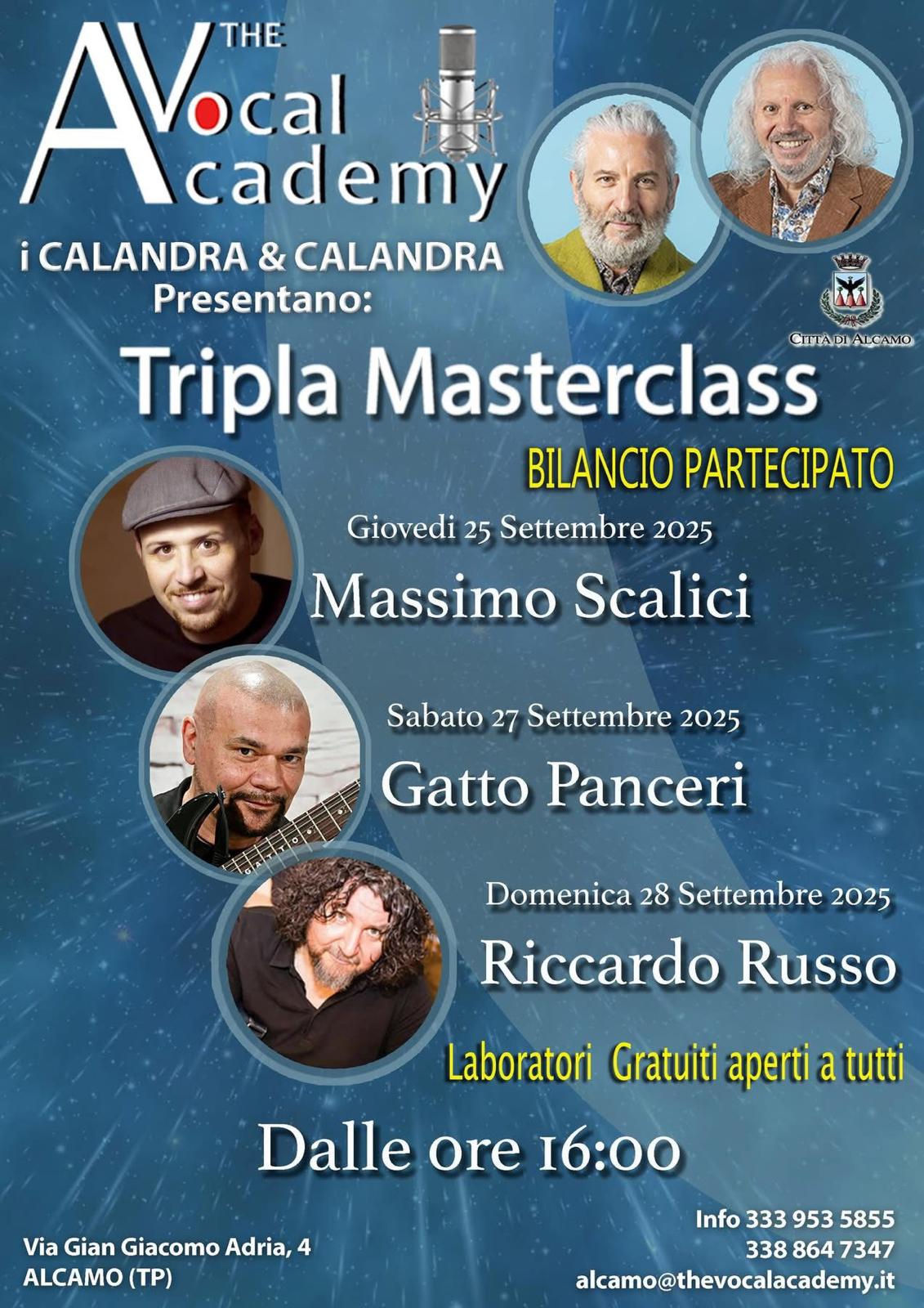 AppuntamentiSpettacoli Gatto Panceri ad Alcamo, masterclass gratuita promossa dalla Vocal Academy (Interviste) By Redazione Alpa Uno - 27 Settembre 2025 FacebookTwitterPinterestWhatsApp Post Views: 434