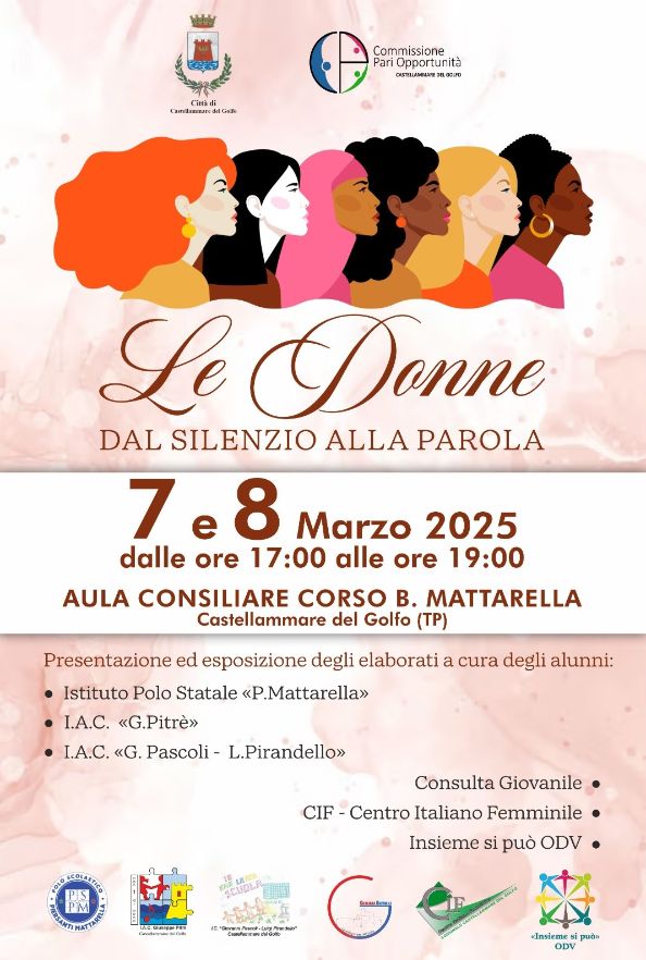 Il 7 e l’8 marzo, dalle ore 17 alle 19, nell’aula consiliare di corso Mattarella a Castellammare del Golfo, appuntamento con “Le donne. Dal silenzio alla parola” una mostra degli elaborati degli studenti del polo statale superiore “Piersanti Mattarella” e degli istituti comprensivi “Giuseppe Pitrè” e “Giovanni Pascoli” in occasione della Giornata internazionale della donna. La mostra proposta agli studenti dalla Commissione comunale pari opportunità, con l’adesione della Consulta giovanile, il Centro italiano femminile, l’associazione “Insieme si può” ed il patrocinio del Comune.