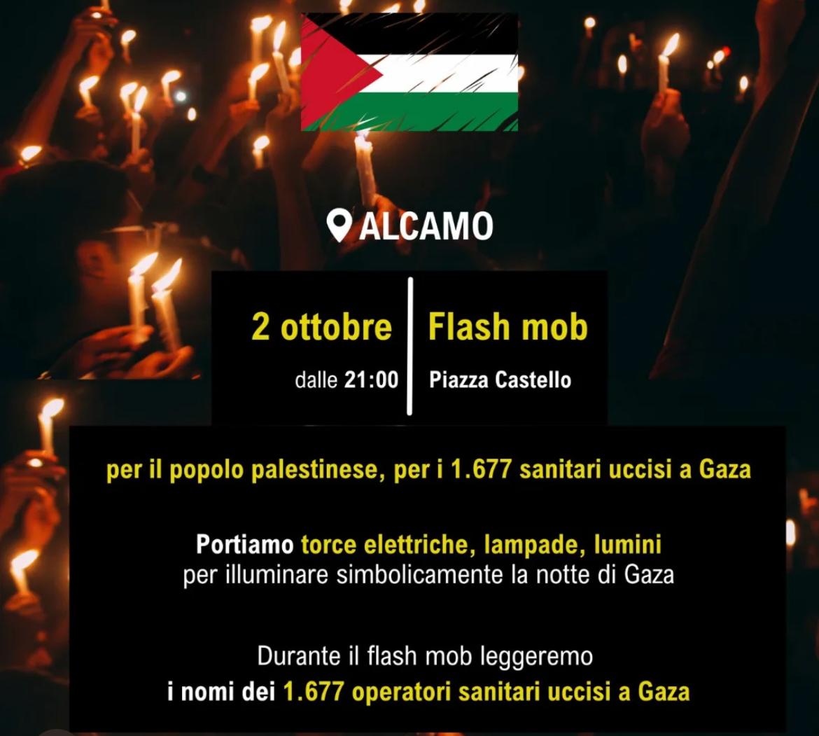 Anche ad Alcamo il flash mob contro il genocidio palestinese, voluto e organizzato da operatrici e operatori sanitaria di tutta Italia. Si terrà giovedì 2 ottobre a Piazza Castello alle 21,00. ‘La nostra professione ci impone di salvare vite’ -le parole degli organizzatori – ‘non possiamo stare a guardare mentre a Gaza si consuma un genocidio’. L’invito alla cittadinanza è di partecipare con torce elettriche, lampade e lumini. Durante il flash mod saranno letti i 1677 nomi de operatori sanitari uccisi a Gaza.