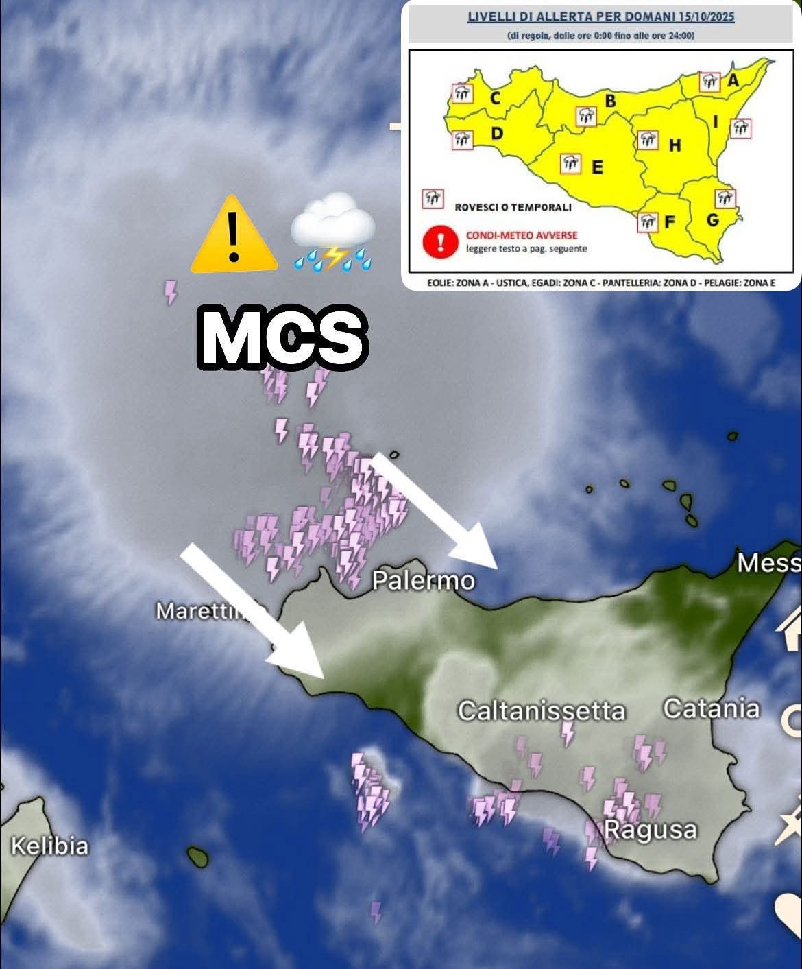 La Sicilia occidentale è in stato di allerta per l’arrivo imminente di un vasto e ben organizzato sistema temporalesco noto come MCS (Mesoscale Convective System). L’attenzione è concentrata in particolare sulle province di Palermo e Trapani, dove si prevedono nubifragi già a partire dalla serata odierna.