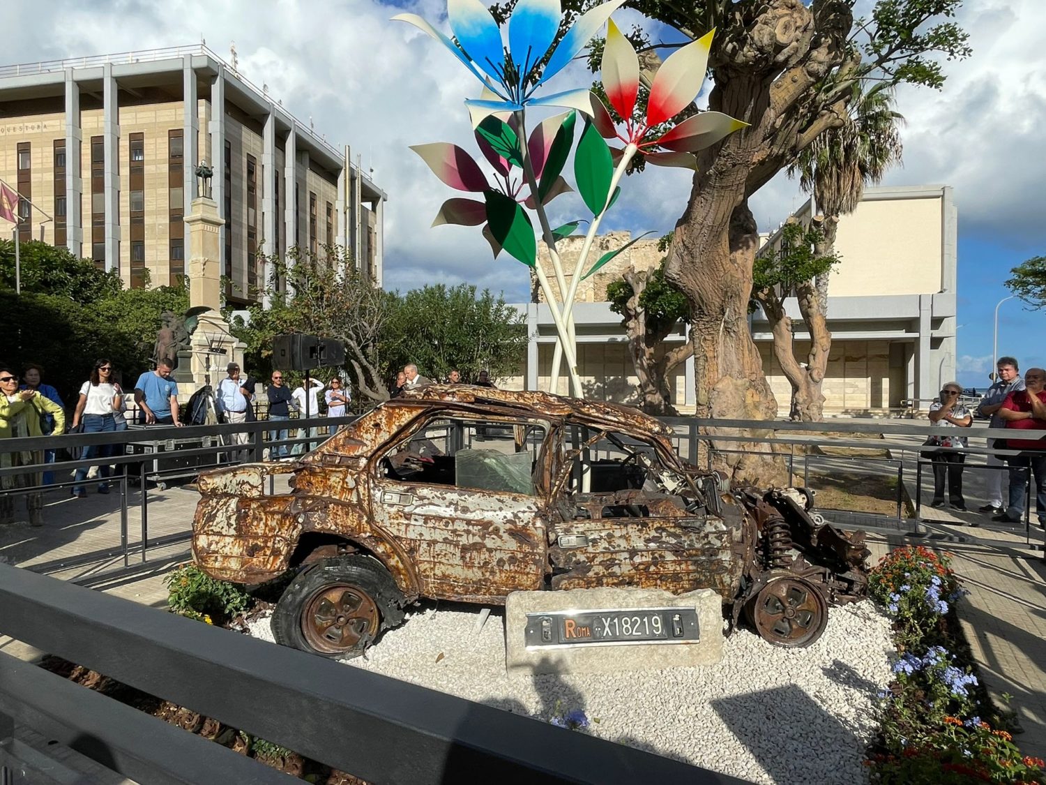 Trapani ha inaugurato oggi un monumento destinato a restare nella memoria collettiva della città e nel cuore dei suoi cittadini. Realizzato dall’artista Massimiliano Errera su iniziativa del Comune, l’opera -collocata in piazza Vittorio Veneto- riprende la carcassa accartocciata dell’auto che trasportava il magistrato Carlo Palermo e la sua scorta, miracolosamente sopravvissuti alla strage di Pizzolungo del 2 aprile 1985, dalla quale persero la vita Barbara Rizzo, Giuseppe e Salvatore Asta. Dal metallo contorto germogliano tre fiori, simbolo di rinascita e speranza: un messaggio chiaro, che trasforma la ferita in futuro.
