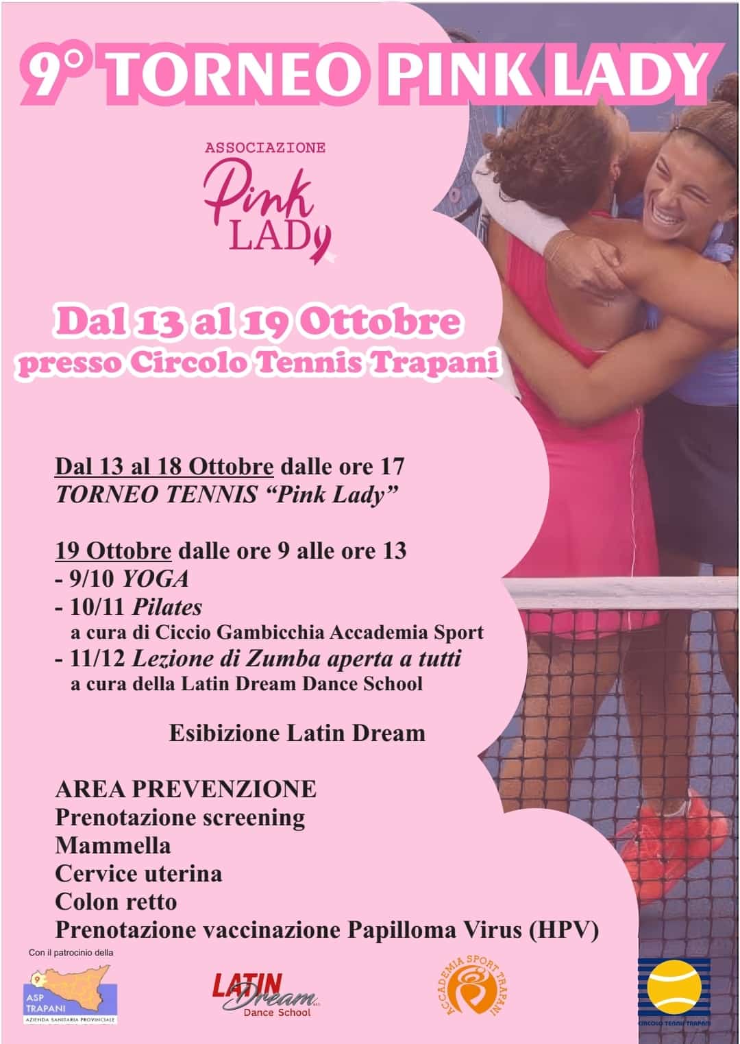 Al via oggi il torneo di tennis femminile Pink Lady, in collaborazione con Asp Trapani in occasione delle iniziative per l’Ottobre Rosa, il mese della prevenzione delle patologie oncologiche femminili. Il torneo, giunto alla sua nona edizione si giocherà al Circolo del Tennis di Trapani e culminerà domenica prossima con la giornata finale in cui sarà possibile prenotare screening, vaccinazioni per l’HPV e saranno presenti diversi esperti per fare prevenzione.